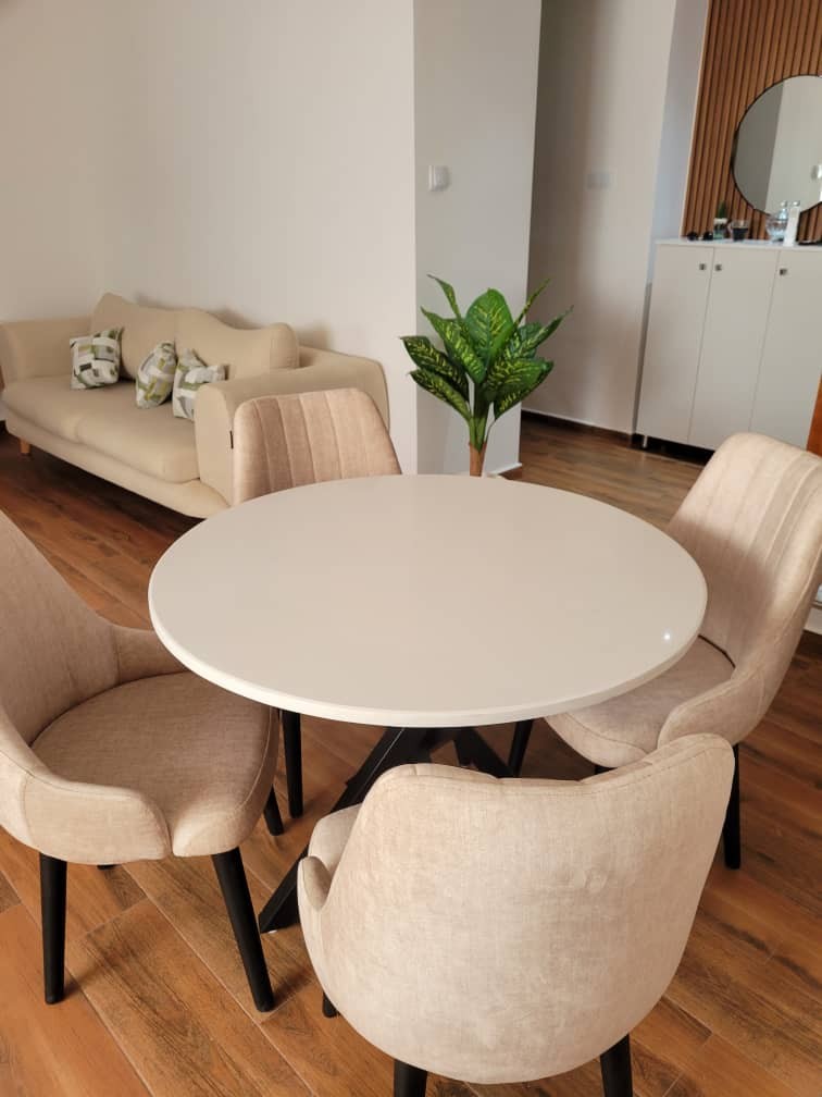 Table a manger CELESTIA dimensions 1m de diamètre Disponible sur-mesure Couleur (noir/gris/beige/blanc/doré/argenté) Matériaux quartz piètement metalique